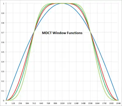 for Vorbis. AC-3 uses a Kaiser-Bessel derived (KBD) window, and MPEG-4 AAC can also use a KBD window.