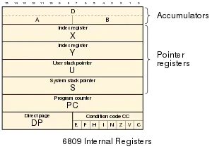 The original 6800 included two 8-bit accumulators, A and B, a single 16-bit index register, X, a 16-bit program counter, PC, a 16-bit stack pointer, SP, and an 8-bit status register. The 6809 added a second index register, Y, a second stack pointer, U (while renaming the original S), and allowed the A and B registers to be treated as a single 16-bit accumulator, D. It also added another 8-bit register, DP, to set the base address of the direct page. These additions were invisible to 6800 code, and the 6809 was 100% source-compatible with earlier code.[11]: 1.1