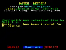 Other features include buying and selling players in the transfer market, organising training for your players and increase your ground's capacity and safety. If the player runs out of money, they will be sacked and offered the job of the bottom team of Division 4, if they choose not to take the job, the game will reset, the same occurs if the player resigns at any time.