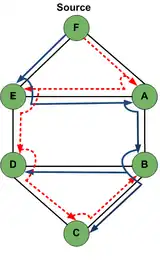 Several protection schemes have been proposed in the literature to protect the multicast connections. The simplest idea to protect the multicast tree from single fiber failure is to compute a link disjoint backup tree. In a link disjoint backup tree, a multicast session from source node F to destination nodes A, B, C, D and E forms a light tree. F is the root and the remaining nodes are the leaves. The primary light tree is shown in solid lines and (directed-link-disjoint) the back up light tree is shown in dotted lines carrying traffic from source node to destinations.[2]