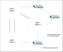 Each instance defines a single forwarding topology for an exclusive set of VLANs, by contrast, STP or RSTP networks contains only a single spanning tree instance for the entire network, which contains all the VLANs. A region can include:[1]