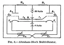 A multivibrator is an electronic circuit used to implement a variety of simple two-state[1][2][3] devices such as relaxation oscillators, timers, latches and flip-flops. The first multivibrator circuit, the astable multivibrator oscillator, was invented by Henri Abraham and Eugene Bloch during World War I. It consisted of two vacuum tube amplifiers cross-coupled by a resistor-capacitor network.[4][5] They called their circuit a "multivibrator" because its output waveform was rich in harmonics.[6] A variety of active devices can be used to implement multivibrators that produce similar harmonic-rich wave forms; these include transistors, neon lamps, tunnel diodes and others. Although cross-coupled devices are a common form, single-element multivibrator oscillators are also common.