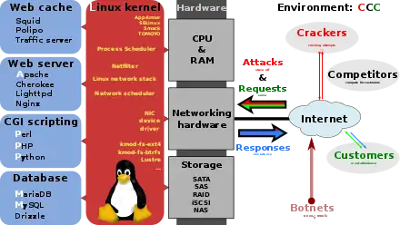 MySQL has stand-alone clients that allow users to interact directly with a MySQL database using SQL, but more often, MySQL is used with other programs to implement applications that need relational database capability. MySQL is a component of the LAMP web application software stack (and others), which is an acronym for Linux, Apache, MySQL, Perl/PHP/Python. MySQL is used by many database-driven web applications, including Drupal, Joomla, phpBB, and WordPress.[10] MySQL is also used by many popular websites, including Facebook,[11][12] Flickr,[13] MediaWiki,[14] Twitter,[15] and YouTube.[16]
