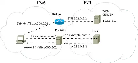 NAT64 is an IPv6 transition mechanism that facilitates communication between IPv6 and IPv4 hosts by using a form of network address translation (NAT). The NAT64 gateway is a translator between IPv4 and IPv6 protocols,[1] for which function it needs at least one IPv4 address and an IPv6 network segment comprising a 32-bit address space. The "well-known prefix" reserved for this service is 64:ff9b::/96.