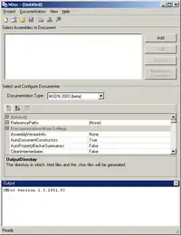 NDoc uses plug-ins to support several different output formats, including CHM, Microsoft Help Viewer, MSDN-style web pages. Incomplete plug-ins are also included as starting points for developers, like the LaTeX plug-in and Javadoc-style web pages. NDoc comes with a graphical user interface to ease the generation process.