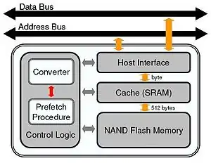The replacement depends on well-designed management of flash memory, which is carried out by either software on a host system (as a raw medium) or hardware circuits/firmware inside its devices. Here, an efficient prediction mechanism with limited memory-space requirements and an efficient implementation is proposed. The prediction mechanism collects the access patterns of program execution to construct a prediction graph by adopting the working set concept. According to the prediction graph, the prediction mechanism prefetches data (/code) to the SRAM cache, so as to reduce the cache miss rate. Therefore, the performance of the program execution is improved and the read performance gap between NAND and NOR is filled up effectively. Using NAND Flash for boot code requires the use of DRAM to shadow the code.[1]