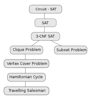 To the right is a diagram of some of the problems and the reductions typically used to prove their NP-completeness. In this diagram, problems are reduced from bottom to top. Note that this diagram is misleading as a description of the mathematical relationship between these problems, as there exists a polynomial-time reduction between any two NP-complete problems; but it indicates where demonstrating this polynomial-time reduction has been easiest.