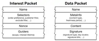 - Data: Once the Interest reaches a node that has the requested data, the node will return a Data packet that contains both the name and the content, together with a signature by the producer's key which binds the two. This Data packet follows in reverse the path taken by the Interest to get back to the requesting consumer.