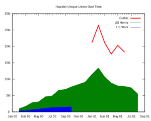 Although there were already networks that facilitated the distribution of files across the Internet, such as IRC, Hotline, and Usenet, Napster specialized in MP3 files of music and a user-friendly interface. At its peak, the Napster service had about 80 million registered users.[7] Napster made it relatively easy for music enthusiasts to download copies of songs that were otherwise difficult to obtain, such as older songs, unreleased recordings, studio recordings, and songs from concert bootleg recordings. Napster paved the way for streaming media services and transformed music into a public good for a brief time.