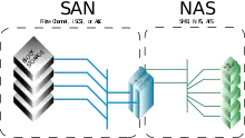 Network-attached storage (NAS) is a file-level (as opposed to block-level storage) computer data storage server connected to a computer network providing data access to a heterogeneous group of clients. The term "NAS" can refer to both the technology and systems involved, or a specialized device built for such functionality (as unlike tangentially related technologies such as local area networks, a NAS device is often a singular unit).
