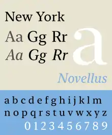 New York is a transitional American serif typeface created by Apple Inc. It was released to developers in June 2019.[1] It is released by Apple freely but solely for use in developing or creating mock-ups of software on Apple platforms.[2]