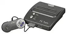 Sharp Corporation produced three licensed variants of the Famicom in Japan, all of which prominently display the shortened moniker rather than the official name, Family Computer.[lower-alpha 6] One variant was a television set with an integrated Famicom; originally released in 1983 as the My Computer TV in 14-inch (36 cm) and 19-inch (48 cm) models,[86] it was later released in the United States in 1989 as a 19-inch model named the Video Game Television.[87][88] Another variant is the Twin Famicom console released in 1986 to combine a Famicom with a Famicom Disk System.[89] Sharp then produced the Famicom Titler in 1989. Intended for video capture and production, it features internal RGB video generation and video output via S-Video, plus inputs for adding subtitles and voice-overs.[90]