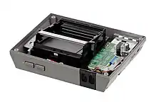 As development progressed on the new video game system, engineers sought Yamauchi's guidance on its features. They questioned whether to include a disk drive, keyboard, or data port, as well as the potential for a modem, expanded memory, and other computer-like capabilities. Nintendo's R&D division considered these options while prioritising cost-effectiveness. Yamauchi ultimately instructed Uemura to prioritise simplicity and affordability. Features like keyboards, modems, and disk drives were omitted entirely. Game cartridges, which Uemura saw as "less intimidating" to consumers was chosen as the format.[23] The team designed the cartridges to store 2,000 bytes of random-access memory (RAM), significantly more than Atari's 256 bytes. This allowed for far more complex games, with thirty-two times the code capacity of Atari cartridges.[24]