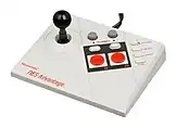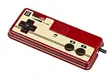 The original model Famicom features two game controllers, both of which are hardwired to the back of the console.[lower-alpha 11] The second controller lacks the START and SELECT button, featuring a small microphone instead; however, few games use this feature.[117] The earliest produced Famicom units have square A and B buttons;[110] issues with them getting stuck when pressed down led Nintendo to change their shape to a circular design in subsequent units following the console's recall.[118][119]