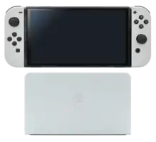 The Nintendo Switch is a hybrid video game console, consisting of a console unit, a dock, and two Joy-Con controllers.[88] Although it is a hybrid console, Nintendo classifies it as "a home console that you can take with you on the go".[89][90] In addition the company says that the Switch and the Nintendo 3DS are meant to co-exist, considering the 3DS as an entry-level product for younger players.[89][91]