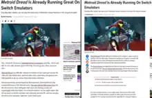 - Zwiezen, Zack (2021-10-09). "Metroid Dread Is Already Running On Switch Emulators". Kotaku. Archived from the original on 2021-10-11. Retrieved 2023-05-05.