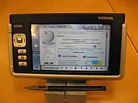 The Nokia 770 Internet Tablet is a wireless Internet appliance from Nokia, originally announced at the LinuxWorld Summit in New York City on 25 May 2005.[1] It is designed for wireless Internet browsing and email functions and includes software such as Internet radio, an RSS news reader, ebook reader, image viewer and media players for selected types of media.
