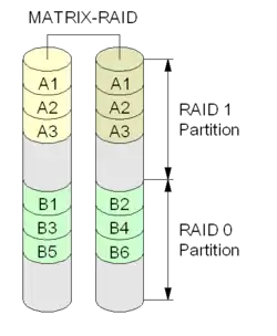 Intel Matrix RAID (a feature of Intel Rapid Storage Technology) is a feature (not a RAID level) present in the ICH6R and subsequent Southbridge chipsets from Intel, accessible and configurable via the RAID BIOS setup utility. Matrix RAID supports as few as two physical disks or as many as the controller supports. The distinguishing feature of Matrix RAID is that it allows any assortment of RAID 0, 1, 5, or 10 volumes in the array, to which a controllable (and identical) portion of each disk is allocated.[7][8][9]
