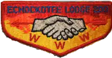 Echockotee Lodge, a chartered Lodge of the National Order of the Arrow, was founded in 1941, with an initial Ordeal held at Camp Echockotee on May 9 of that year. The first Ordeal class of 36 candidates was made up of youth and adults selected by a council committee, for their prior service to Scouting and the Summer Camp program. The initial totem of the fledgling Lodge was the alligator, but in an organizational meetings that summer, the totem was changed to that of the left-handed handclasp, and the name of the camp was adopted as the Lodge name ("Echockotee" is a Seminole word meaning "we are brothers"). For many years the Lodge was active with Summer Camp activities, holding meetings at the end of camp or occasionally at the Seminole Hotel in Jacksonville during the year. Echockotee hosted the first statewide gathering of lodges, called Area Meetings in 1945, 1946 and 1947 (among the first such gatherings in the country). Not until the mid-1950s did regularly scheduled lodge weekends take place away from Summer Camp, as Echockotee does today.