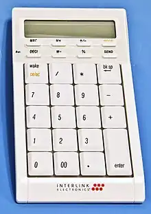 A numeric keypad, number pad, numpad, or ten key,[1][2][3] is the palm-sized, usually-17-key section of a standard computer keyboard, usually on the far right. It provides calculator-style efficiency for entering numbers. The idea of a 10-key number pad cluster was originally introduced by Tadao Kashio, the developer of Casio electronic calculators.