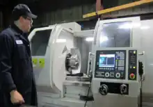 | Lathe | Cuts workpieces while they are rotated. Makes fast, precision cuts, generally using indexable tools and drills. Effective for complicated programs designed to make parts that would be unfeasible to make on manual lathes. Similar control specifications to CNC mills and can often read G-code. Generally have two axes (X and Z), but newer models have more axes, allowing for more advanced jobs to be machined. Most modern lathes have live tooling, allowing for limited milling operations to take place without having to remove the part from the lathe spindle. Second operations can be completed by using a sub-spindle, which is co-axial to the main spindle, but faces the other direction. This allows the part to be removed from the main spindle, and for additional features to be machined in the back side of the part. | |