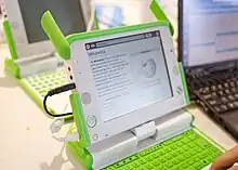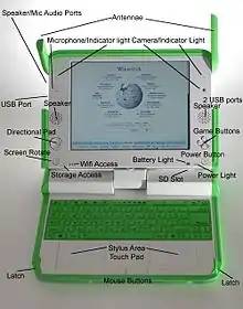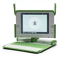 The OLPC XO (formerly known as $100 Laptop,[2] Children's Machine,[3] 2B1[4]) is a low cost laptop computer intended to be distributed to children in developing countries around the world,[5] to provide them with access to knowledge, and opportunities to "explore, experiment and express themselves" (constructionist learning).[6] The XO was developed by Nicholas Negroponte, a co-founder of MIT's Media Lab, and designed by Yves Behar's Fuseproject company.[7] The laptop is manufactured by Quanta Computer and developed by One Laptop per Child (OLPC), a non-profit 501(c)(3) organization.