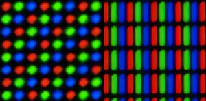 In color mode (when lit primarily from the rear), the display does not use the common RGB pixel geometry for liquid crystal computer displays, in which each pixel contains three tall thin rectangles of the primary colors. Instead, the XO-1 display provides one color for each pixel. The colors align along diagonals that run from upper-right to lower left (see diagram on the right). To reduce the color artifacts caused by this pixel geometry, the color component of the image is blurred by the display controller as the image is sent to the screen. Despite the color blurring, the display still has high resolution for its physical size; normal displays as of February 2007 put about 588(H) × 441(V) to 882(H) × 662(V) pixels in this amount of physical area and support subpixel rendering for slightly higher perceived resolution. A Philips Research study measured the XO-1 display's perceived color resolution as effectively 984(H) × 738(V).[38][39][40] A conventional liquid crystal display with the same number of green pixels (green carries most brightness or luminance information for human eyes) as the OLPC XO-1 would be 693 × 520. Unlike a standard RGB LCD, resolution of the XO-1 display varies with angle. Resolution is greatest from upper-right to lower left, and lowest from upper-left to lower-right. Images which approach or exceed this resolution will lose detail and gain color artifacts. The display gains resolution when in bright light; this comes at the expense of color (as the backlight is overpowered) and color resolution can never reach the full 200 dpi sharpness of grayscale mode because of the blur which is applied to images in color mode.