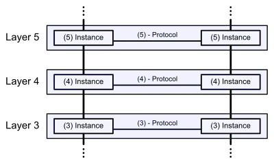 Communication protocols enable an entity in one host to interact with a corresponding entity at the same layer in another host. Service definitions, like the OSI model, abstractly describe the functionality provided to a layer N by a layer N−1, where N is one of the seven layers of protocols operating in the local host.