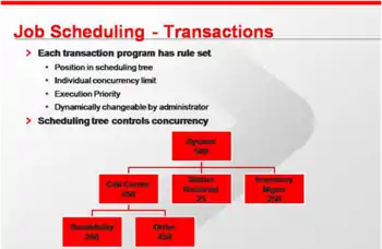 Transactions execute as runs but without any stored or submitted control statements. Instead when a message is received from a session defined as a transaction session, it is scanned to determine the transaction queue on which it is to be placed. This is normally determined by the first characters of the message but user-written scanners may be added.[13]