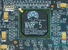 Warp 5 - OTI 64317 [6][7] - During the mid 1990s, Oak was developing their first and only 2D/3D graphics accelerator chip. Warp 5 was to be a tile-based deferred renderer (TBDR), similar to PowerVR's chipsets but was the first to combine tiling with other high performance rendering algorithms including anti aliasing and tri linear mip mapping.[8] In the same vein as the S3 ViRGE chip, the Warp 5 was pin-compatible with a 2D-only predecessor.