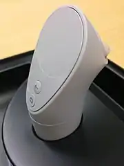 The Oculus Go controller is a wireless, orientation-tracked remote controller with pointer capabilities that is used to interact with applications and games.[54][49] In addition to a touchpad, the controller has three buttons that can be used to select things, go back to a previous screen or menu, and return to the Go's home screen. The controller is powered by a single AA battery and allows for either hand to be chosen to function through the Oculus Go.[48][39]