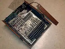 The company was originally outfitted from the Cheiky's garage and was dedicated to the production of electronic teaching aids.[3] The company's original name—Ohio Scientific Instruments, Inc.—reflected this initial purpose.[9] The first products the company released included a calculator that also taught the basics of statistics and a single-board microcomputer.[10][9] The latter, called the Microcomputer Trainer Board and incorporating a MOS Technology 6502 microprocessor,[11] was designed by Mike, inspired by his experience with microprocessor-based minicomputers at his Ohio Nuclear job.[3]