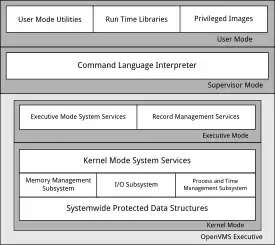 The OpenVMS Executive comprises the privileged code and data structures which reside in the system space. The Executive is further subdivided between the Kernel, which consists of the code which runs at the kernel access mode, and the less-privileged code outside of the Kernel which runs at the executive access mode.[91]