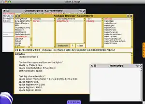 Open Cobalt uses the Squeak software environment, which is an open-source Smalltalk system freely available for Windows, Mac and Unix. As is true of almost any Smalltalk application, Open Cobalt has identical functioning on any supported platform. As a Smalltalk system, it can usually be updated while the system is running without needing a restart.