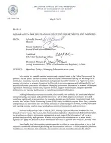 In May 2013 Barack Obama issued an executive order which established the Open Data Policy along with a memorandum from the Office of Management and Budget which supported that policy. These policies were developed as a way to promote economic growth and create jobs.[11] They were guided by precedents and policies of the Sunlight Foundation and Open Knowledge.[1] The Sunlight Foundation said at the establishment of the policy that it "certainly appears to be the strongest index and audit requirement" that the organization had seen.[12]