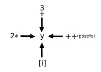- Abstracting the issue of precedence or binding, consider the diagram above for the expression 3+2*y[i]++. The compiler's job is to resolve the diagram into an expression, one in which several unary operators (call them 3+( . ), 2*( . ), ( . )++ and ( . )[ i ]) are competing to bind to y. The order of precedence table resolves the final sub-expression they each act upon: ( . )[ i ] acts only on y, ( . )++ acts only on y[i], 2*( . ) acts only on y[i]++ and 3+( . ) acts 'only' on 2*((y[i])++). It is important to note that WHAT sub-expression gets acted on by each operator is clear from the precedence table but WHEN each operator acts is not resolved by the precedence table; in this example, the ( . )++ operator acts only on y[i] by the precedence rules but binding levels alone do not indicate the timing of the postfix ++ (the ( . )++ operator acts only after y[i] is evaluated in the expression).
