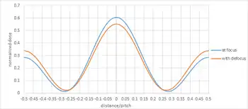 Aberrations in optical projection systems deform wavefronts, or the spectrum or spread of illumination angles, which can affect the depth of focus. While the use of OPC can offer significant benefits to depth of focus, aberrations can more than offset these benefits.[3] Good depth of focus requires diffracted light traveling at comparable angles with the optical axis, and this requires the appropriate illumination angle.[4] Assuming the correct illumination angle, OPC can direct more diffracted light along the right angles for a given pitch, but without the correct illumination angle, such angles will not even arise.