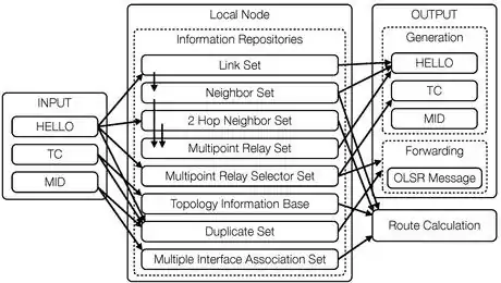 OLSR makes use of "Hello" messages to find its one hop neighbors and its two hop neighbors through their responses. The sender can then select its multipoint relays (MPR) based on the one hop node that offers the best routes to the two hop nodes. Each node has also an MPR selector set, which enumerates nodes that have selected it as an MPR node. OLSR uses topology control (TC) messages along with MPR forwarding to disseminate neighbor information throughout the network. Host and network association (HNA) messages are used by OLSR to disseminate network route advertisements in the same way TC messages advertise host routes.