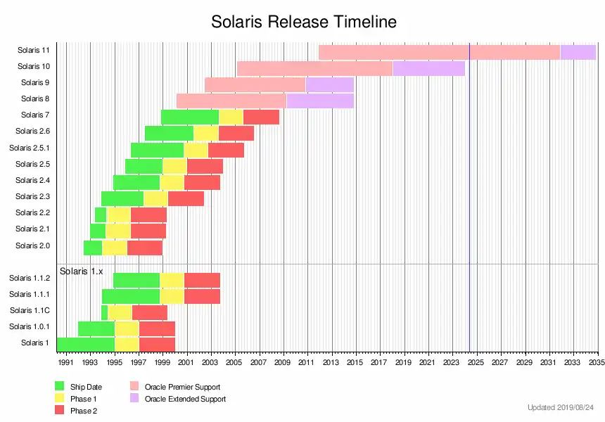 | 10 | 5.10 | January 31, 2005 | January 2027 | SVR4 | before Oracle acquisition in March 2010, open source under CDDL after March 2010, Post-Oracle closed source |