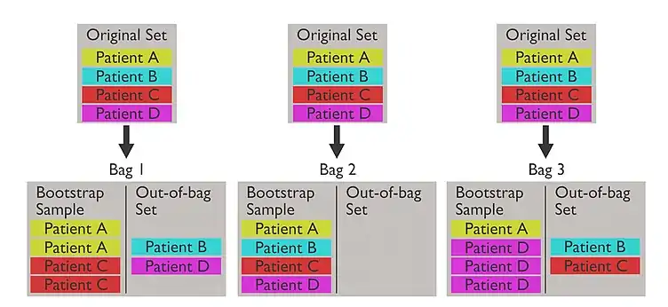 This example shows how bagging could be used in the context of diagnosing disease. A set of patients are the original dataset, but each model is trained only by the patients in its bag. The patients in each out-of-bag set can be used to test their respective models. The test would consider whether the model can accurately determine if the patient has the disease.