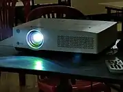 A projector is a display that projects the computer image onto a surface through the use of a high power lamp. These displays are seen in use to show slideshow presentations or in movie screenings.[3]