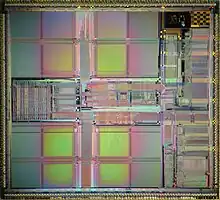 This design includes a famous "silicon doodle" of a velociraptor dinosaur (visible here in upper right corner of the die shot image).[2]