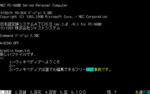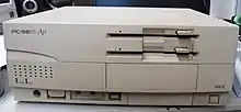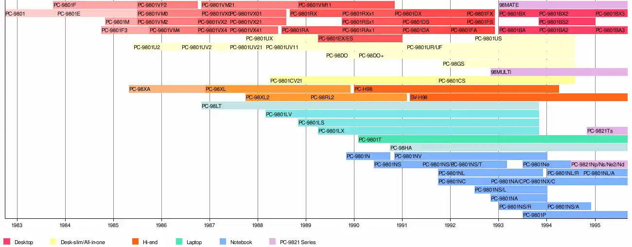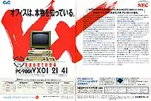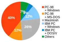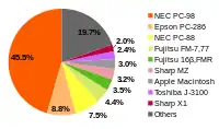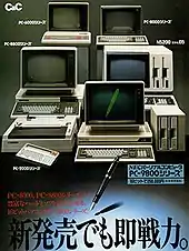 The PC-9800 series (Japanese: PC-9800シリーズ, Hepburn: Pī Shī Kyūsen Happyaku Shirīzu), commonly shortened to PC-98 or 98 (キューハチ, Kyū-hachi),[3] is a lineup of Japanese 16-bit and 32-bit personal computers manufactured by NEC from 1982 to 2000. The platform established NEC's dominance in the Japanese personal computer market, and, by 1999, more than 18 million units had been sold.[4] While NEC did not market these specific machines in the West, it sold the NEC APC series, which had similar hardware to early PC-98 models.