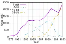 While NEC did not market these specific machines in the West, it sold the NEC APC III, which had similar hardware as early PC-98 models.[25] However, NEC began selling an IBM clone (APC IV) outside Japan in 1986.[26] By 1990, 2 million PC-9800/9801 units were sold in Japan.[27]