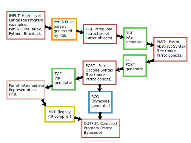 The Parrot compiler toolchain is broken into several parts, of which PGE is the first. PGE converts source code to parse trees. The Tree Grammar Engine (TGE) then converts these into Parrot Abstract Syntax Trees (PAST). A second TGE pass then converts a PAST into Parrot Opcode Syntax Trees (POST) which can be directly transformed into executable bytecode.