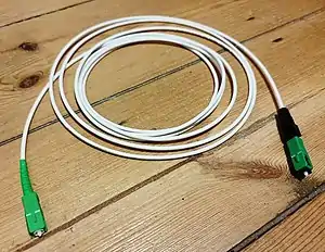A passive optical network consists of an optical line terminal (OLT) at the service provider's central office (hub), passive (non-power-consuming) optical splitters, and a number of optical network units (ONUs) or optical network terminals (ONTs), which are near end users.[2][3] There may be amplifiers between the OLT and the ONUs.[4] Several fibers from an OLT can be carried in a single cable with several optical fibers.[5] A PON reduces the amount of fiber and central office equipment required compared with point-to-point architectures with dedicated connections for every user. A passive optical network is a form of fiber-optic access network. Bandwidth is shared among users of a PON.[6][7]