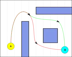 Multi-agent pathfinding is to find the paths for multiple agents from their current locations to their target locations without colliding with each other, while at the same time optimizing a cost function, such as the sum of the path lengths of all agents. It is a generalization of pathfinding. Many multi-agent pathfinding algorithms are generalized from A*, or based on reduction to other well studied problems such as integer linear programming.[10] However, such algorithms are typically incomplete; in other words, not proven to produce a solution within polynomial time. Some parallel approaches, such as Collaborative Diffusion, are based on embarrassingly parallel algorithms spreading multi-agent pathfinding into computational grid structures, e.g., cells similar to cellular automata. A different category of algorithms sacrifice optimality for performance by either making use of known navigation patterns (such as traffic flow) or the topology of the problem space.[11]