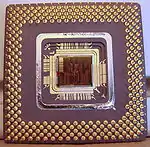 The P54C was followed by the P54CQS in early 1995, which operated at 120 MHz. It was fabricated in a 350 nm BiCMOS process and was the first commercial microprocessor to be fabricated in a 350 nm process.[23] Its transistor count is identical to the P54C and, despite the newer process, it had an identical die area as well. The chip was connected to the package using wire bonding, which only allows connections along the edges of the chip. A smaller chip would have required a redesign of the package, as there is a limit on the length of the wires and the edges of the chip would be further away from the pads on the package. The solution was to keep the chip the same size, retain the existing pad-ring, and only reduce the size of the Pentium's logic circuitry to enable it to achieve higher clock frequencies.[23]