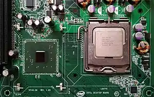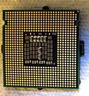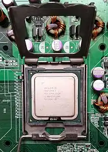 Pentium D[2] is a range of desktop 64-bit x86-64 processors based on the NetBurst microarchitecture, which is the dual-core variant of the Pentium 4 manufactured by Intel. Each CPU comprised two cores. The brand's first processor, codenamed Smithfield and manufactured on the 90 nm process, was released on May 25, 2005, followed by the 65 nm Presler nine months later.[3] The core implementation on the 90 nm "Smithfield" and later 65 nm "Presler" are designed differently but are functionally the same. The 90 nm "Smithfield" contains a single die, with two adjoined but functionally separate CPU cores cut from the same wafer. The later 65 nm "Presler" utilized a multi-chip module package, where two discrete dies each containing a single core reside on the CPU substrate. Neither the 90nm "Smithfield" nor the 65 nm "Presler" were capable of direct core to core communication, relying instead on the northbridge link to send information between the 2 cores.