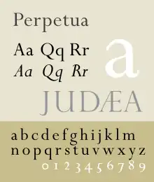 Perpetua is a serif typeface that was designed by the English sculptor and stonemason Eric Gill for the British Monotype Corporation. Perpetua was commissioned at the request of Stanley Morison, an influential historian of printing and adviser to Monotype around 1925, when Gill's reputation as a leading artist-craftsman was high.[1] Perpetua was intended as a crisp, contemporary design that did not follow any specific historic model, with a structure influenced by Gill's experience of carving lettering for monuments and memorials. Perpetua is commonly used for covers and headings and also sometimes for body text and has been particularly popular in fine book printing.[2][3][4] Perpetua was released with characters for the Greek alphabet and a matching set of titling capitals for headings.